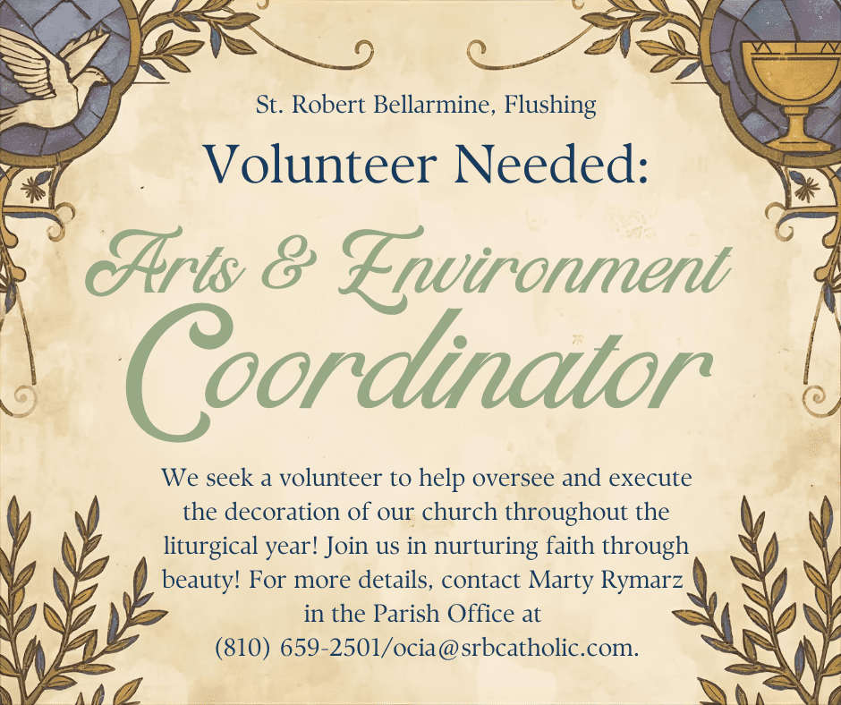 Meals for CGS Formation We’re looking for volunteers to provide a light dinner for participants in The Catechesis of… Read More Arts & Environment Coordinator Volunteer! Do you have a creative eye and a love for bringing beauty to sacred spaces?… Read More